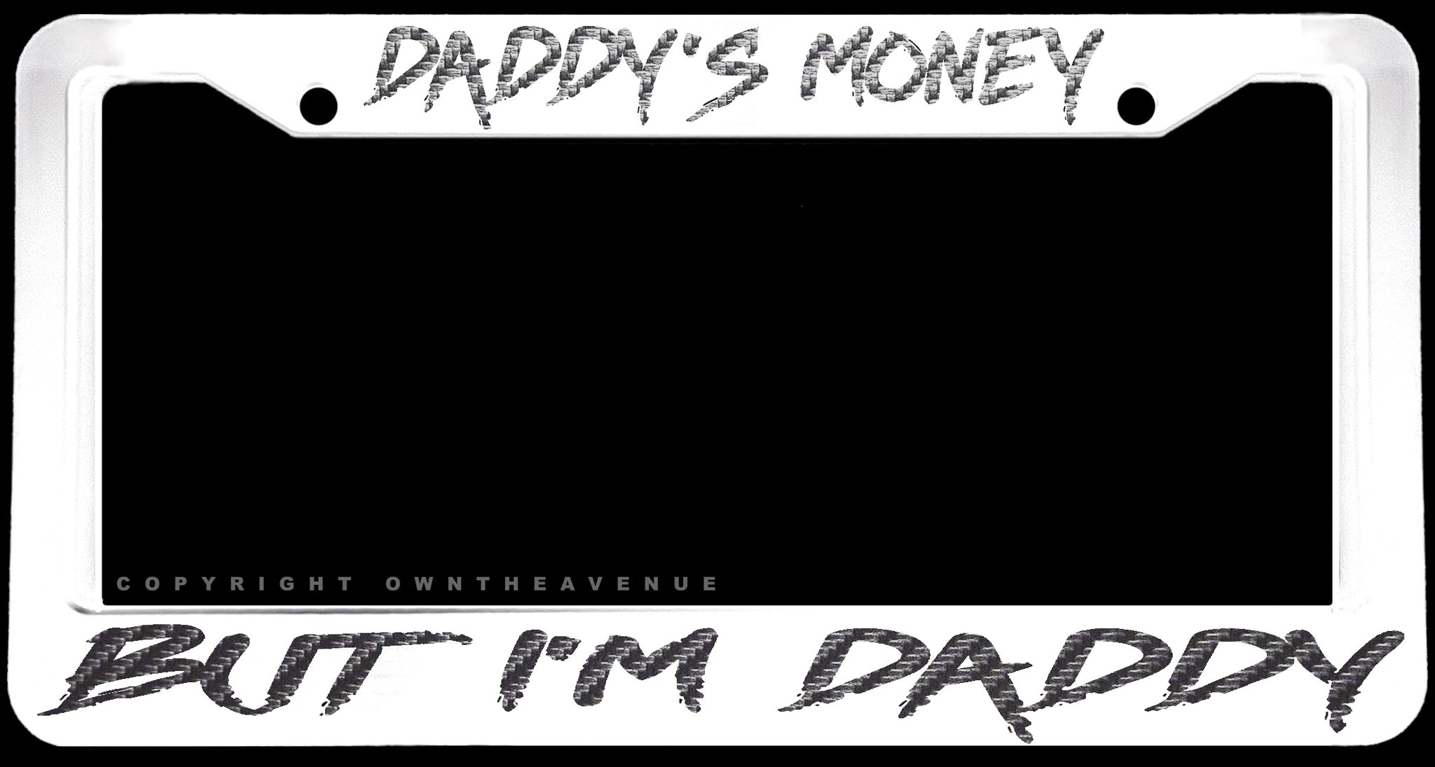 Daddy's Money But I'm Daddy Carbon Vinyl Print White License Plate Frame